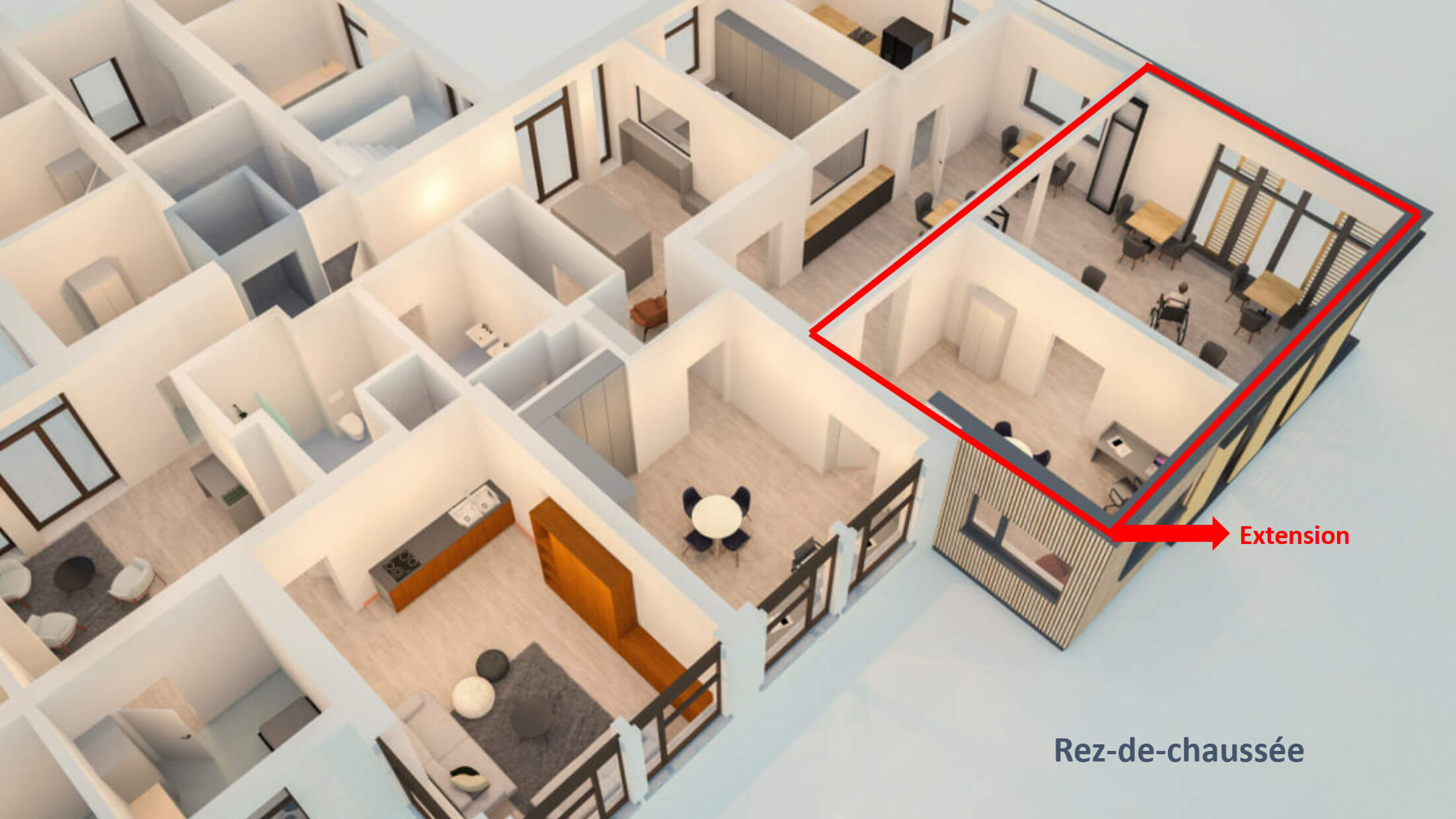 - Redistribution et réaménagement des pièces de vie communautaires.